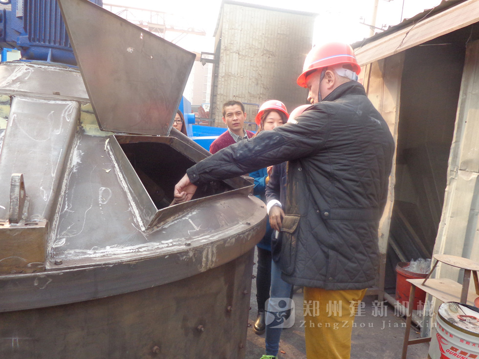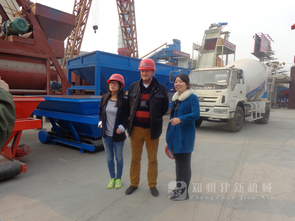 2014年11月,來自俄羅斯的客戶來到鄭州建新公司簽訂了兩套時產120方混凝土攪拌站設備的大訂單,下圖為建新公司銷售部劉經理、經理帶客戶參觀建新公司的生產車間及成品貨場。